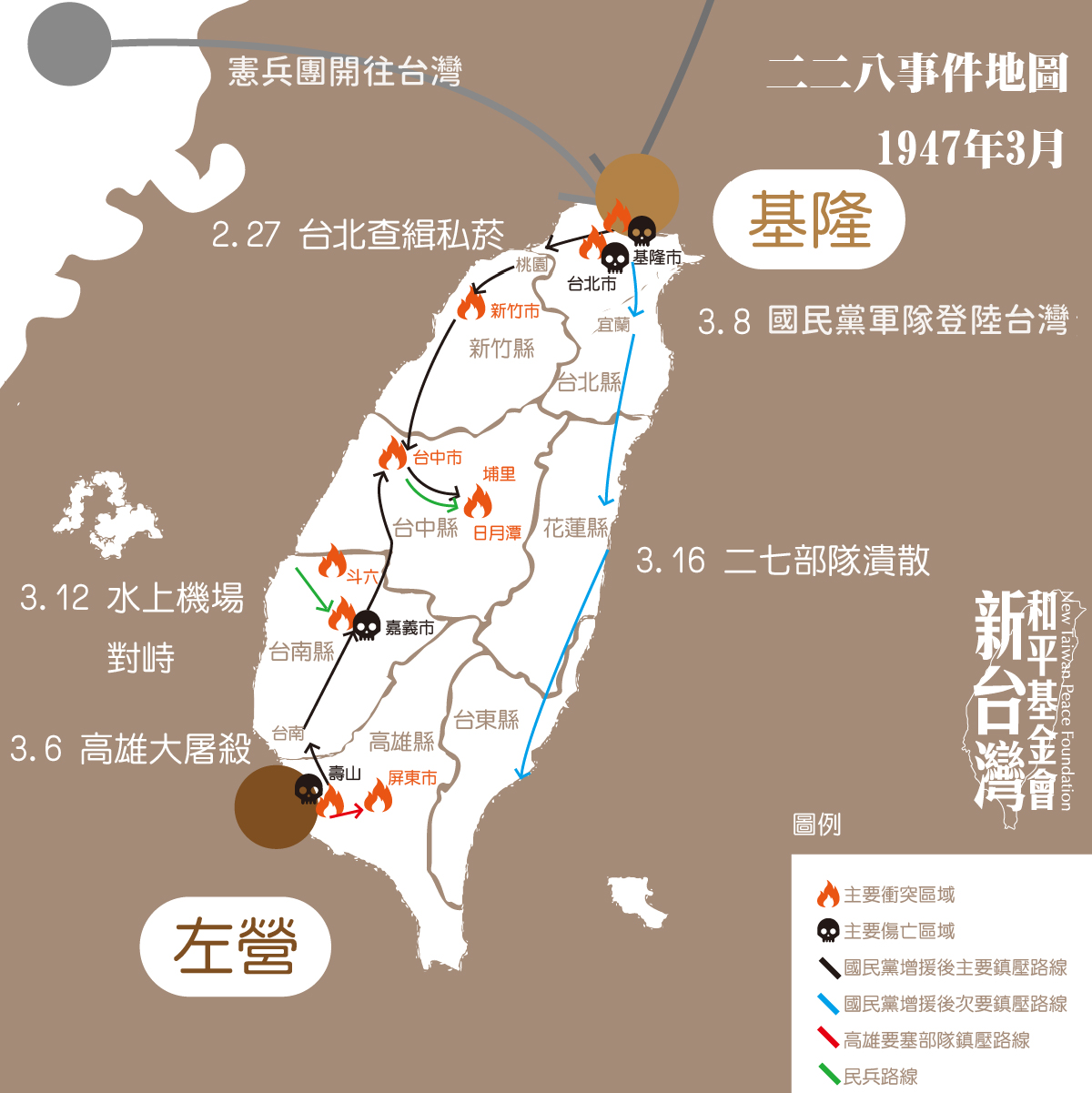 1947年3月8日,國民黨部隊登陸基隆,隨即由北到南展開全台血腥鎮壓。