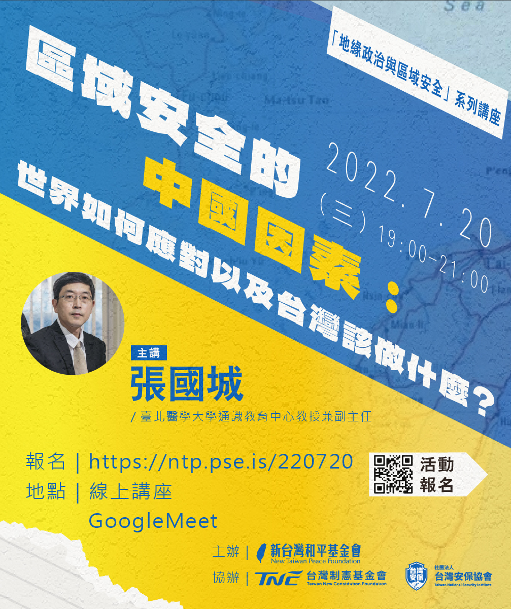 此次講座,特別邀請了擅長國際關係理論、國家安全與軍事戰略、兩岸關係與中國研究的張國城老師,為我們深入解析區域安全的「中國因素」之最新進展。歡迎各位朋友、夥伴7/20(三)晚上7:00一起來討論。