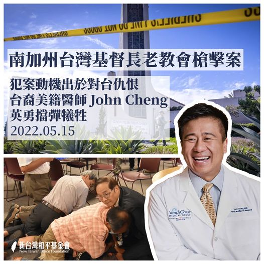 ▍男子進入爾灣台灣基督長老教會持槍掃射,John Cheng 英勇擋彈犧牲