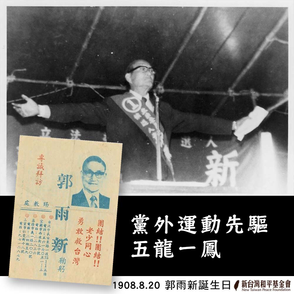 1979年美麗島事件發生前,許多人是透過郭雨新,才將台灣政治犯名單及坐黑牢受迫害的情事,傳遞到海外,讓海外的台灣人也適時給予島內受苦的人一點物質上的援助。
