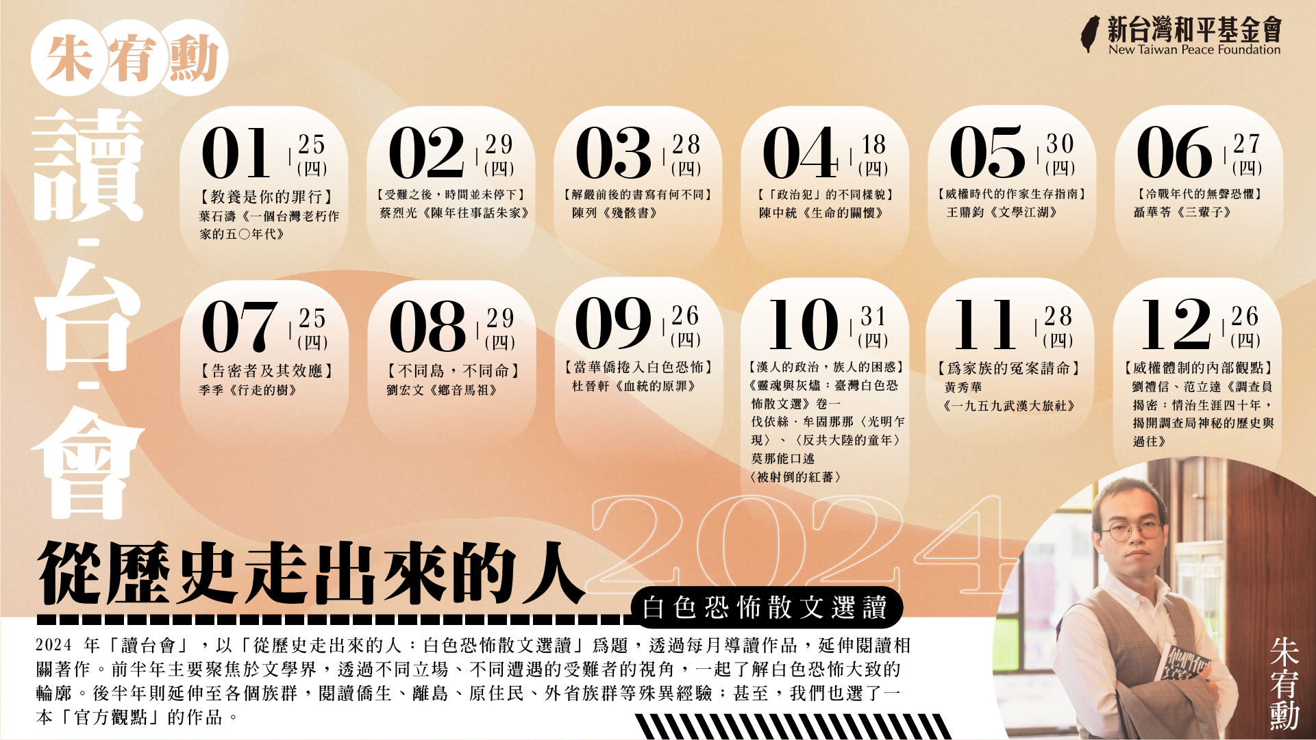 2024 年「讀台會」,以「從歷史走出來的人:白色恐怖散文選讀」為題,透過每月導讀作品,延伸閱讀相關著作。