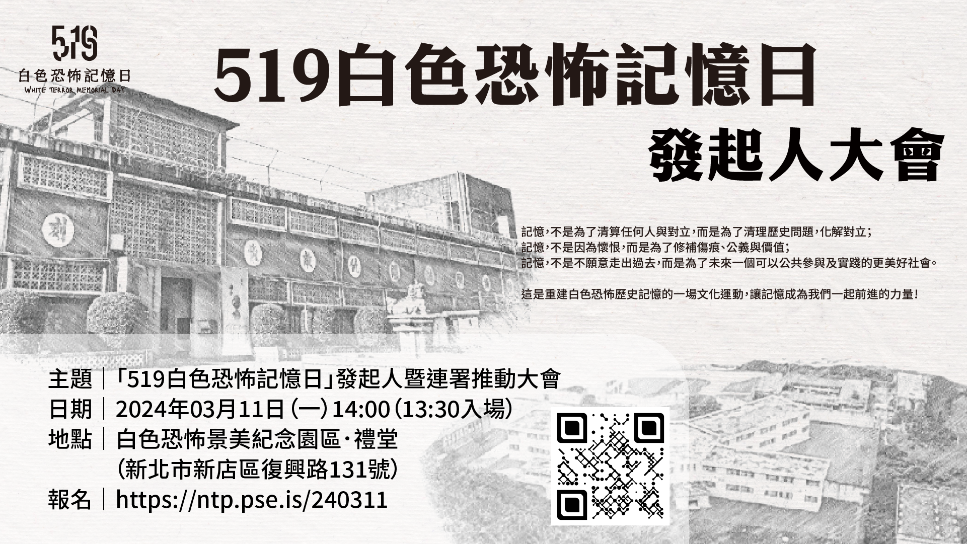 在此誠摯敬邀您,一同支持「519 白色恐怖記憶日」發起人大會,攜手為傳承台灣歷史記憶工程全力以赴。