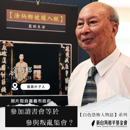 涂炳榔,1929 年3 月 28 日生,嘉義朴子人,就讀台北師範學院期間,因參與讀書會閱讀左派書籍而遭到逮捕。1952 年 7 月 22 日,以「連續參加叛亂之集會」之罪名,判處 10 年有期徒刑。