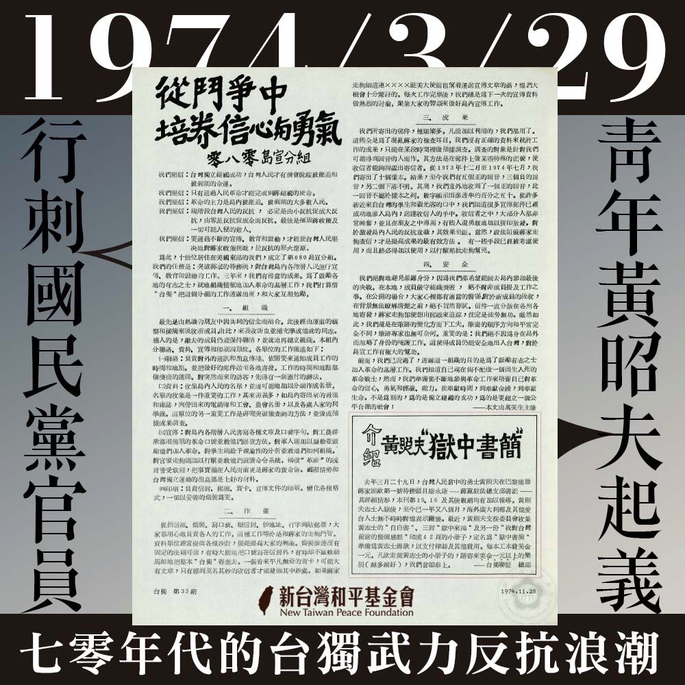 包括1970年2月8日泰源監獄武裝起義、1970年4月22日行刺蔣經國、1976年1月高雄變電所遭破壞、1976年10月王幸男郵包炸彈事件等,都是發生在這個時期,而青年黃昭夫起義行刺國民黨官員就是其中的事件之一。