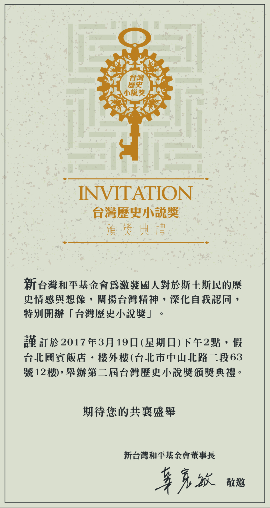 第二屆台灣歷史小說獎頒獎典禮將於3月19日舉辦,敬請受邀貴賓踴躍出席。