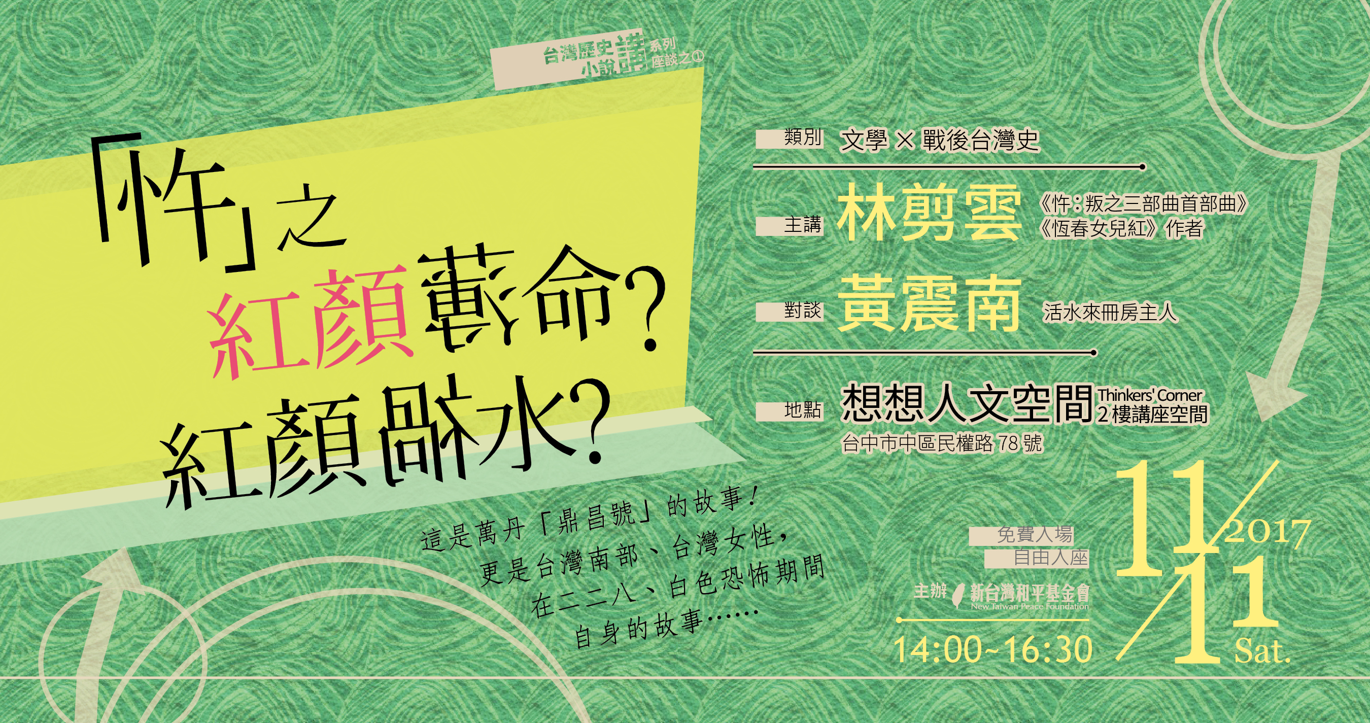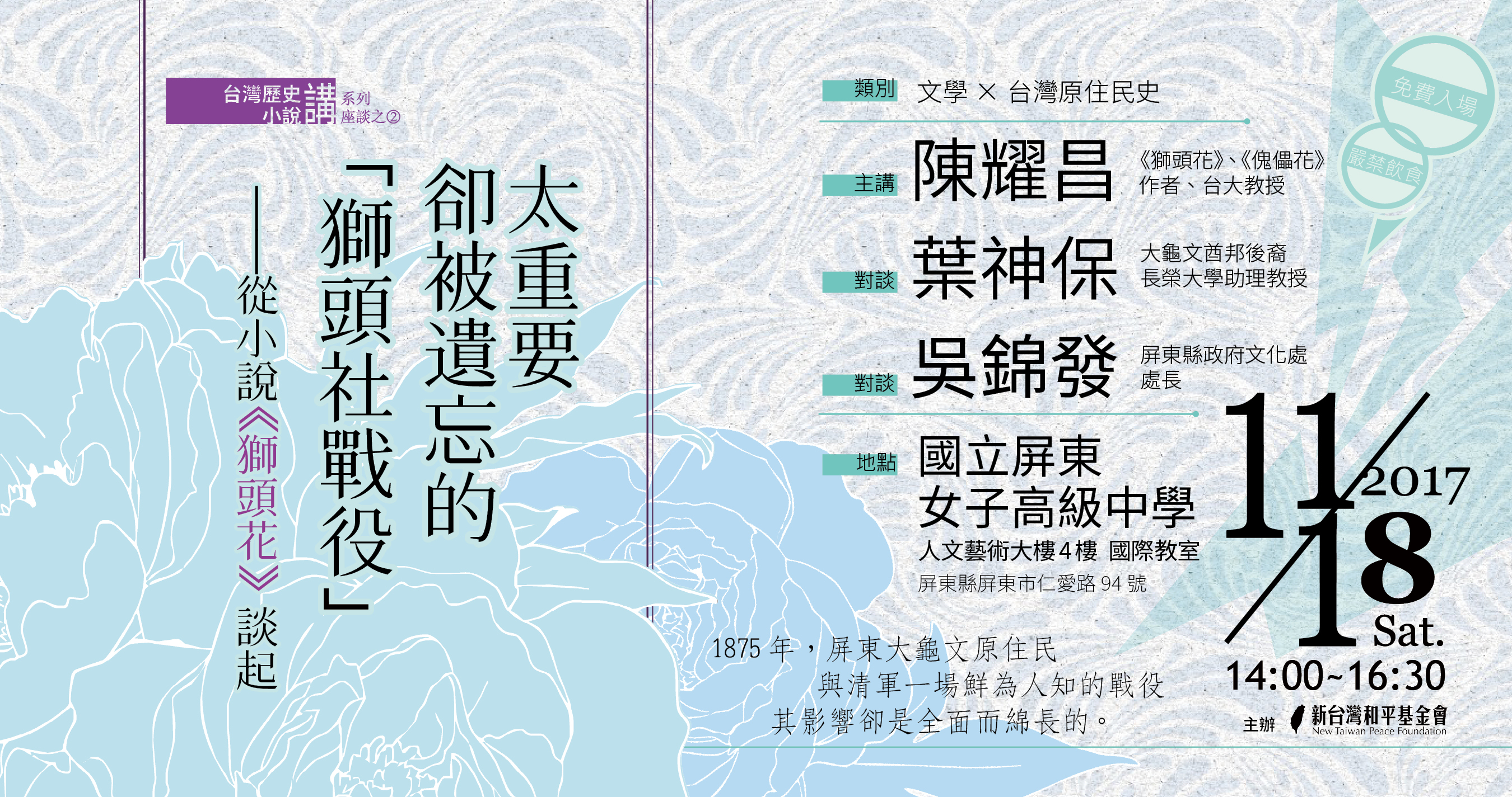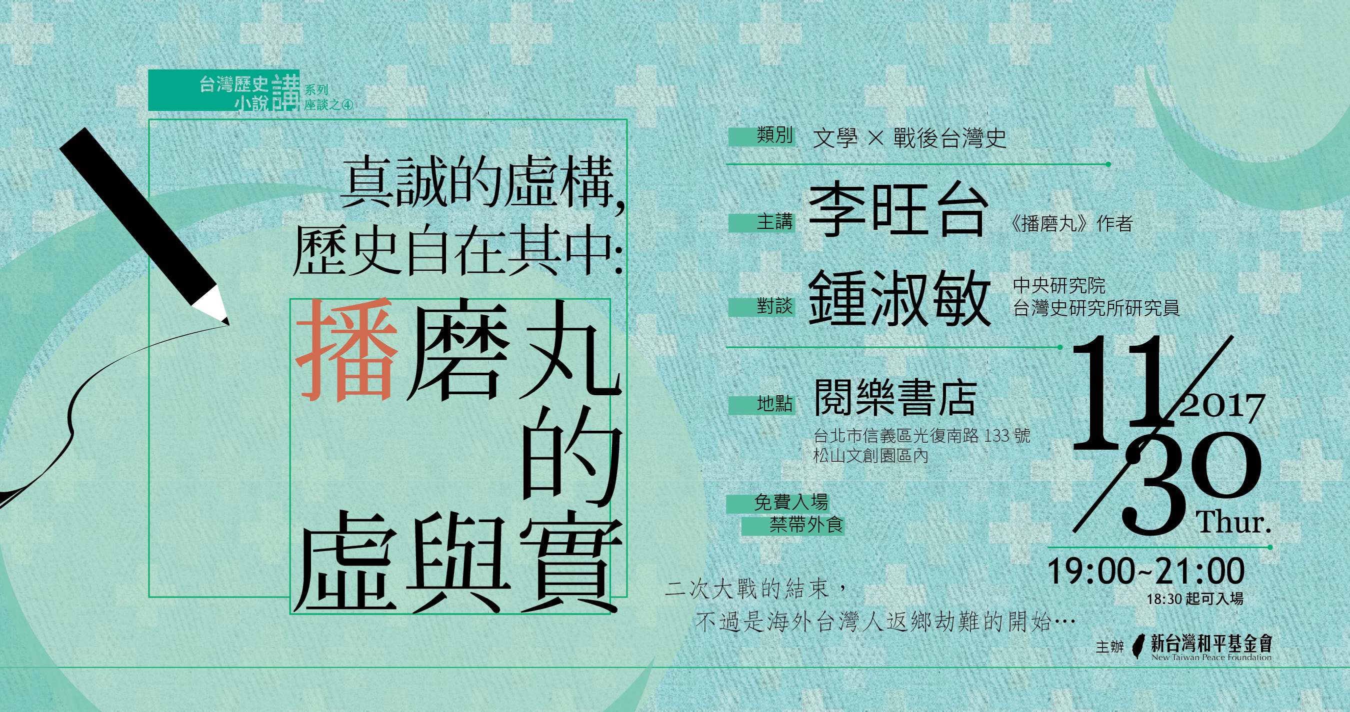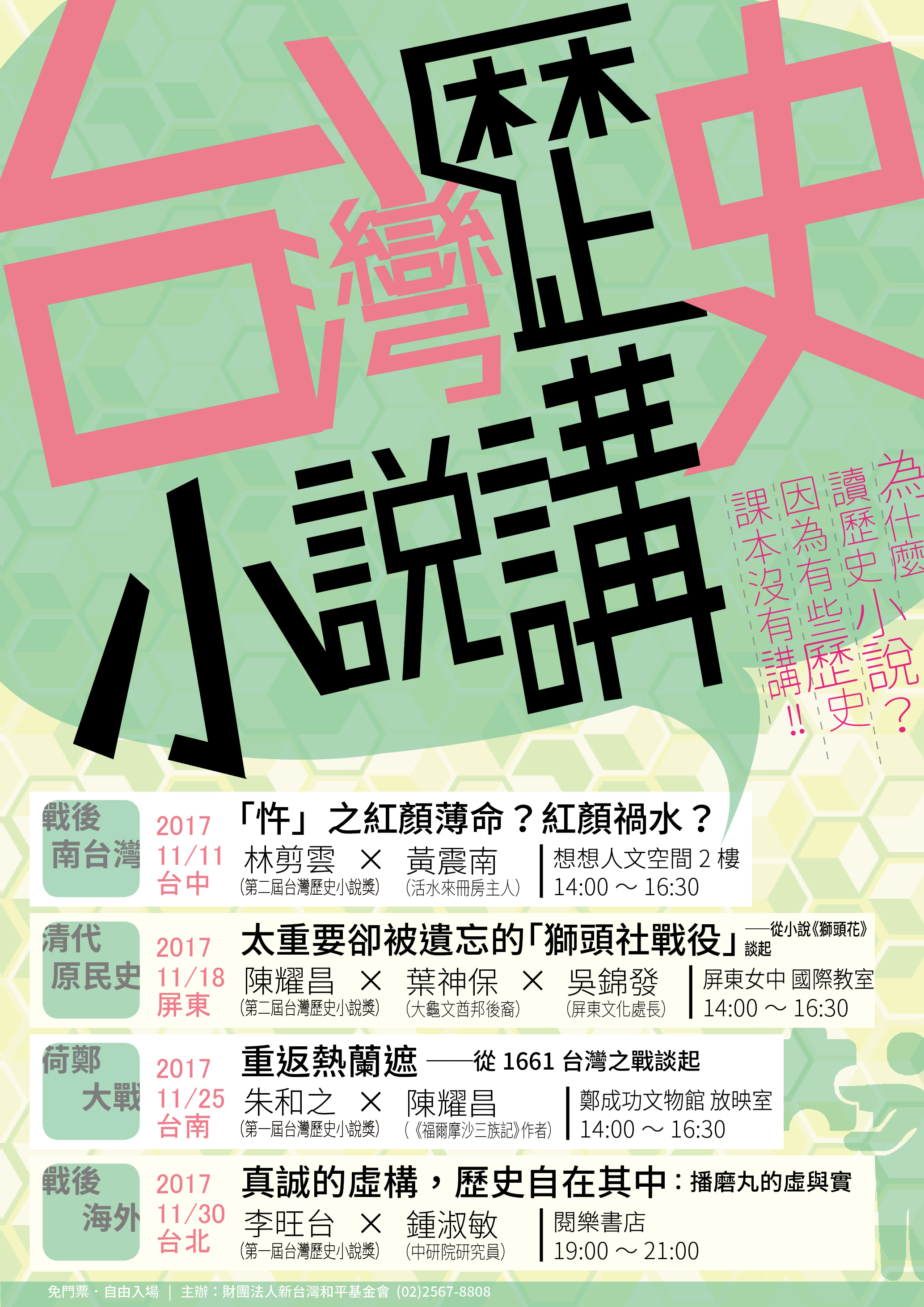 而在台灣歷史小說講的四場講座中,將由2015年、2016年「台灣歷史小說獎」得獎者分享創作台灣歷史小說的經驗與觀點,告訴你如何創作或閱讀一篇歷史小說,並藉著小說回顧時常為人所忽略的、過去的、台灣的、真實。