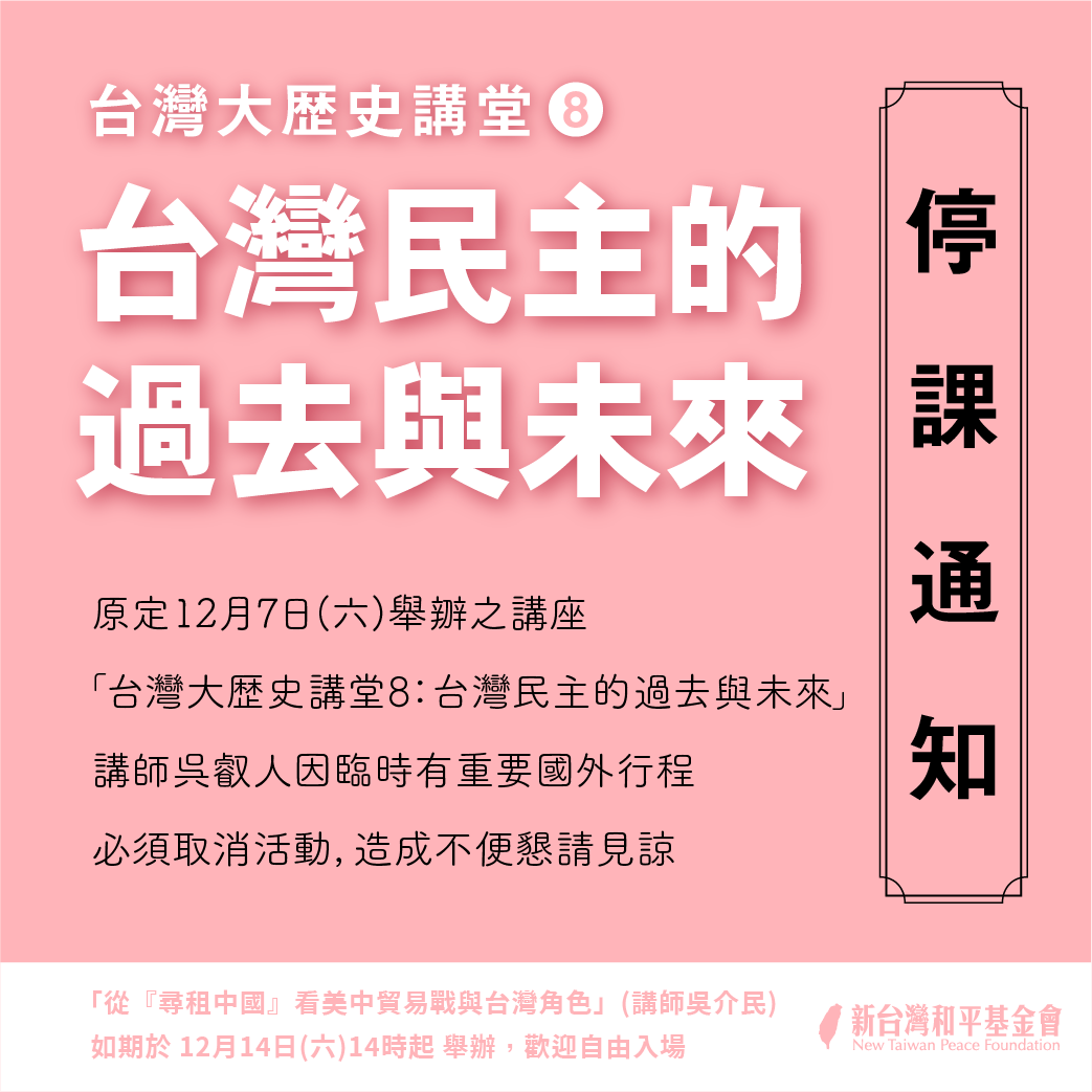 【12/7 停課通知】 「#台灣大歷史講堂 8:台灣民主的過去與未來」 因講師吳叡人臨時有重要國外行程,必須取消活動。