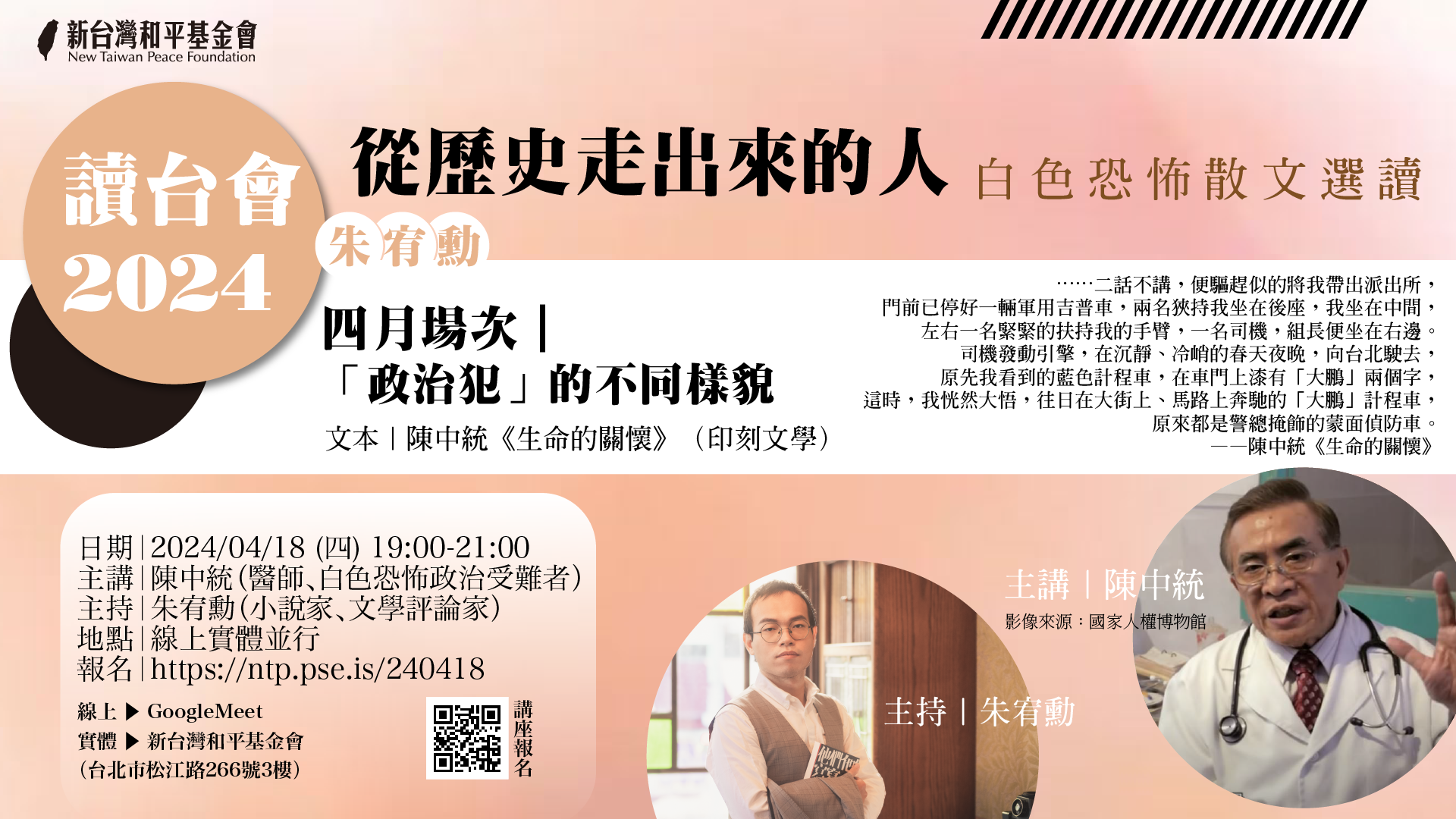 2024 年「讀台會」,以「從歷史走出來的人:白色恐怖散文選讀」為題,透過每月導讀作品,延伸閱讀相關著作。