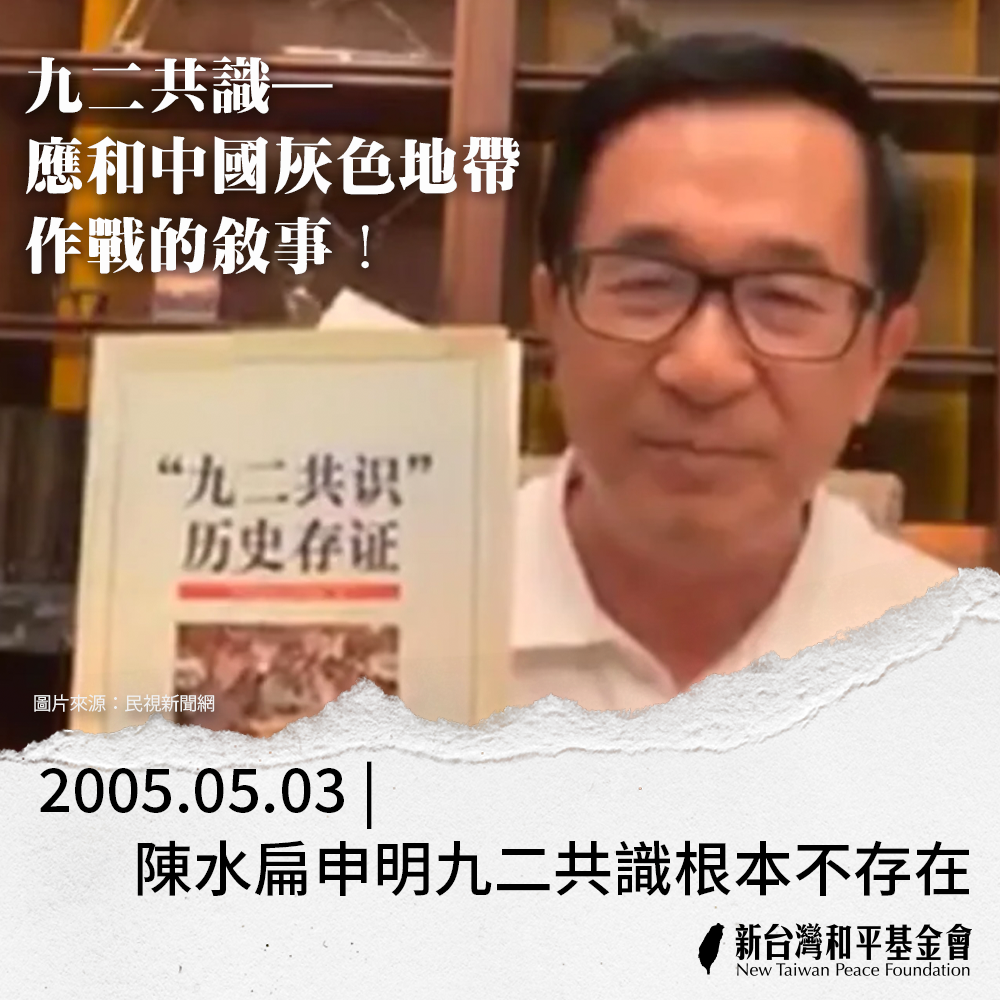 2005 年 5 月 3 日,陳水扁出訪友邦吉里巴斯,在媒體餐敘時他提道:「所謂的『九二共識』,根本不存在,因為 1992 年兩岸在香港的會談中,國民黨和中國共產黨並沒有就一個中國達成共識。一方說『一中原則』,另一方說一『中各表』,連這點都沒有共識,怎麼會有九二共識呢?」