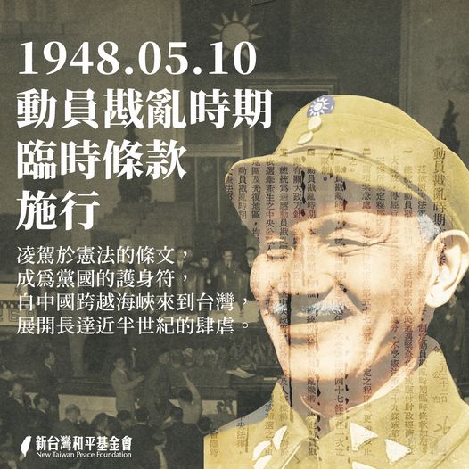1948 年 5 月 10 日,國共內戰的兵荒馬亂將至尾聲,正值國民政府危急存亡之秋,匆忙之際,國民大會通過的《動員戡亂時期臨時條款》就此實施。凌駕於憲法的條文,成為黨國的護身符,自中國跨越海峽來到台灣,展開長達近半世紀的肆虐。