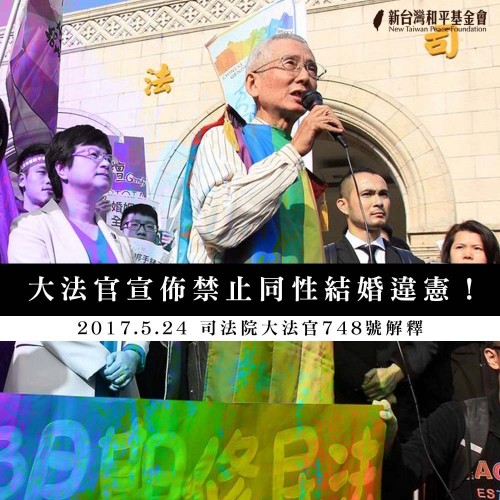 2017年5月24日,司法院大法官會議(今憲法法庭)作成 #釋字第748號解釋,宣告《民法》禁止同性婚姻違憲。立法院於2019年5月17日(國際不再恐同日)制定《釋字第748號解釋施行法》,台灣成為亞洲第一個正式承認同性婚姻的國家。